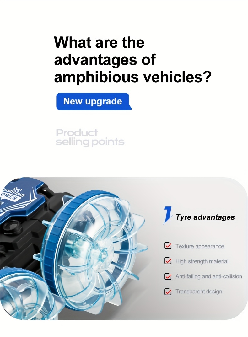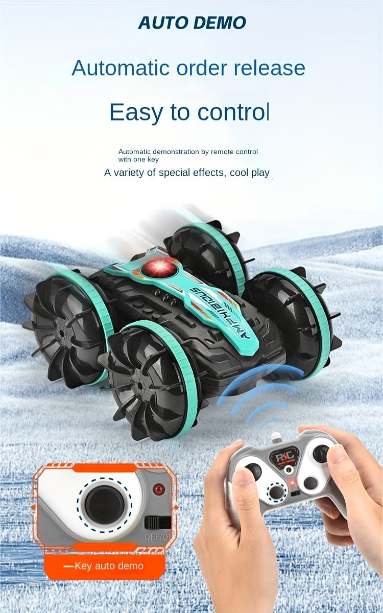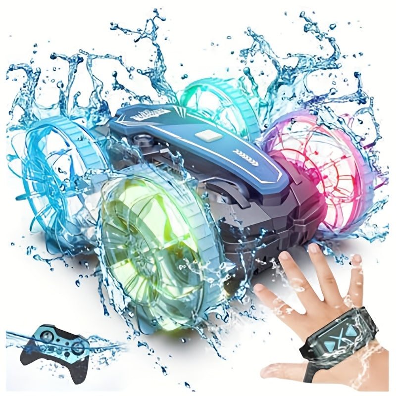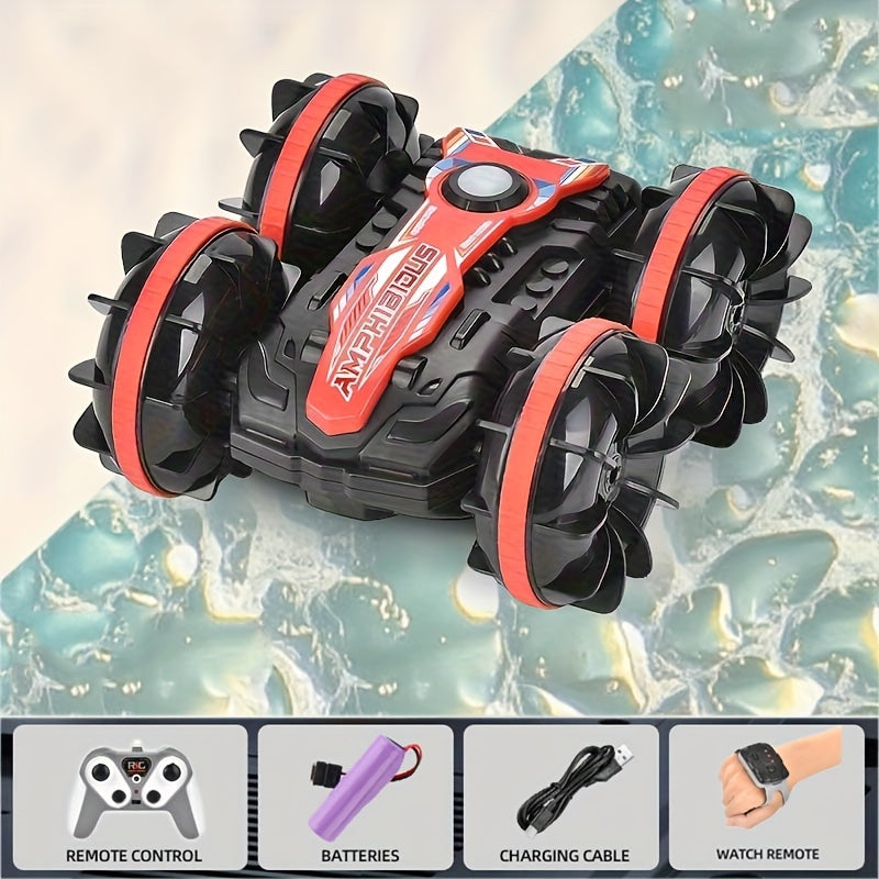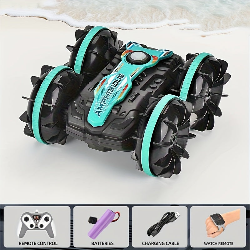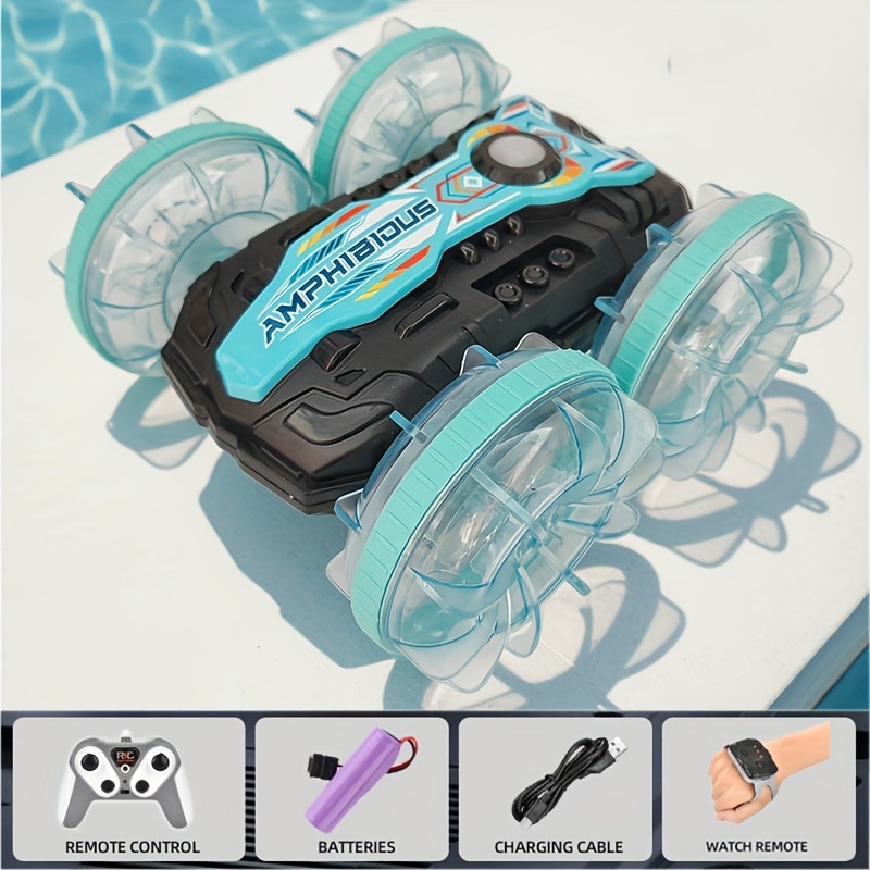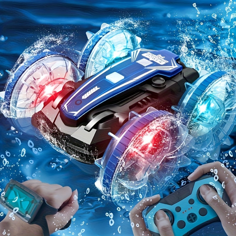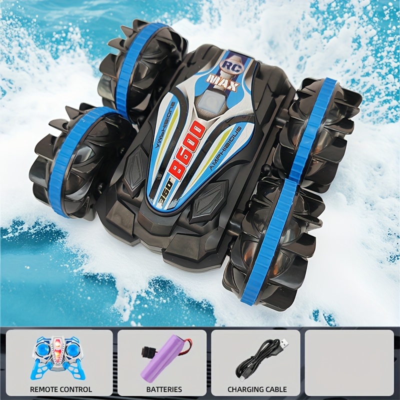Med VattenBil får du två fordon i ett – kör i full fart på marken och kör sedan rakt ner i vattnet utan att stanna. Den här fjärrstyrda hybriden bjuder på oändlig lekglädje, oavsett om du är vid sjön, poolen eller i trädgården.