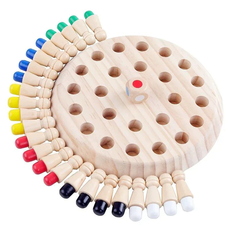 ✔️ En person börjar rulla tärningen för att se vilken färg den ska leta efter, om tärningen t.ex blir blå, ska denna spelare hitta en blå plugg. Plockar spelaren en blå, vinner den pluggen och få slå igen, plockar spelaren fel färg, återplaceras pluggen och det är nästa spelares tur.